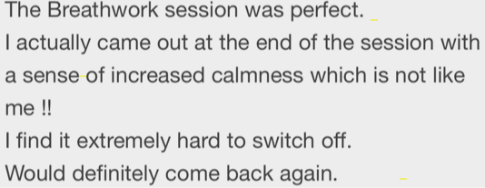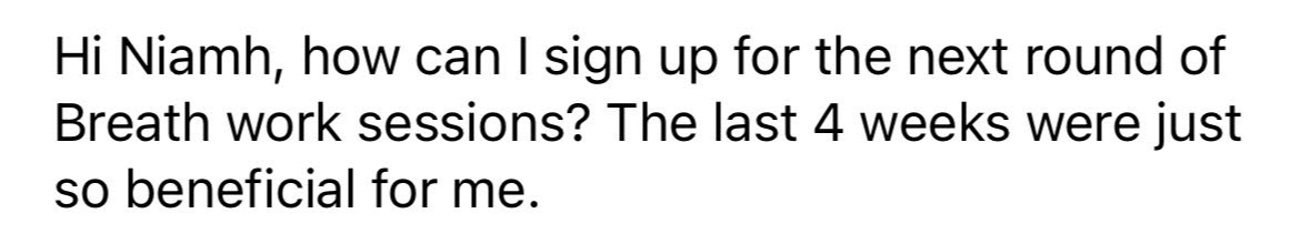 "Really enjoyed the Intro to Breathwork classes. Niamh created such a relaxing environment, and taught the breathing techniques in a clear and accessible way. Have found all the tips learned very handy for regulating and grounding myself during stressful times. Couldn’t recommend the classes enough, breathwork is something we should all have in our stress-management toolbox!"